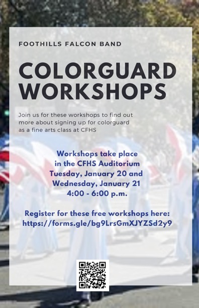 Next Tuesday, January 20 and Wednesday, January 21, we are hosting colorguard workshops in the high school music hall from 4 - 6 pm for anyone who is interested in joining the colorguard as a part ...