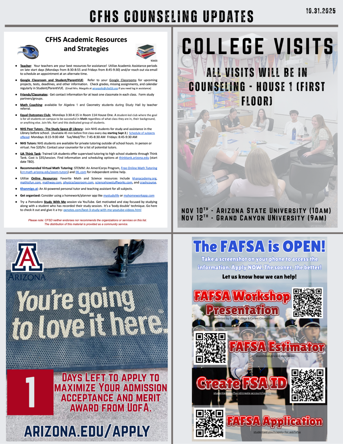 If any student is interested in tutoring or extra help in any subject area, we offer FREE, walk-in peer tutoring from National Honor Society students. This is available every morning in the CFHS Library starting 45 minutes before school begins. Please consider taking advantage of this wonderful opportunity. No appointments or advance notice required - just walk in. For any questions, please ask your school counselor.