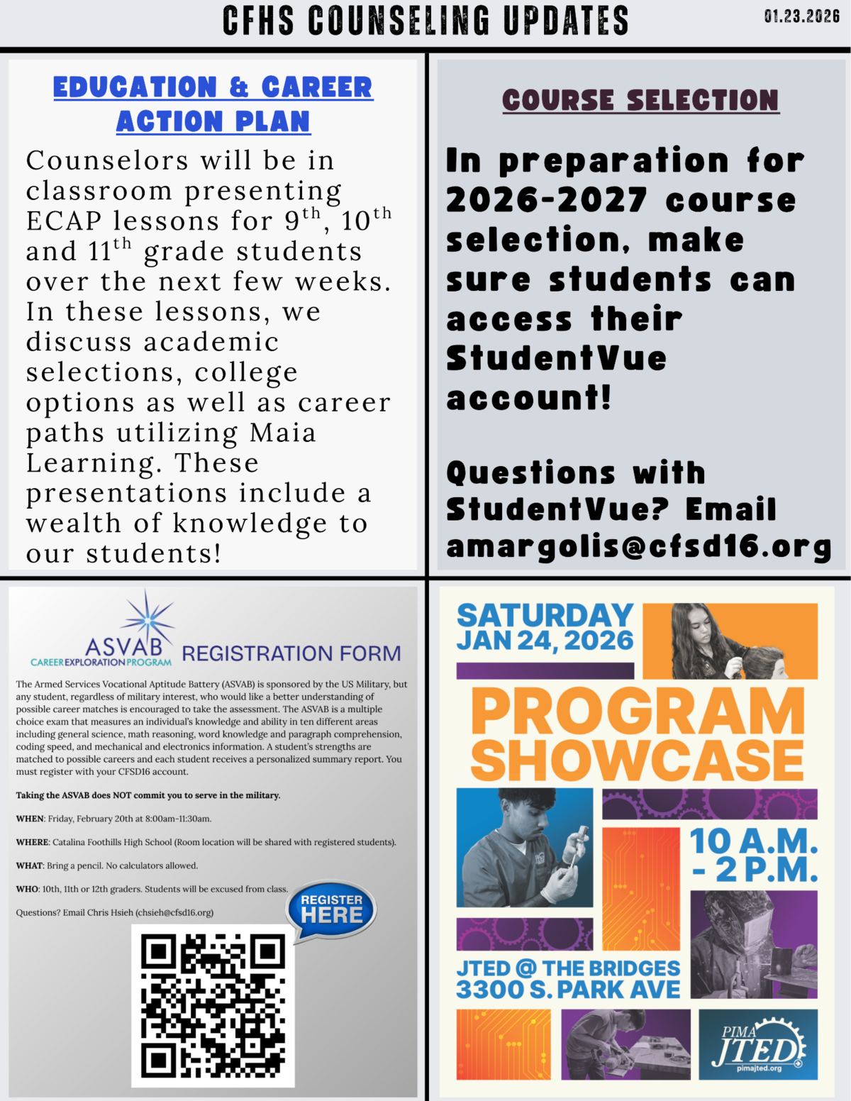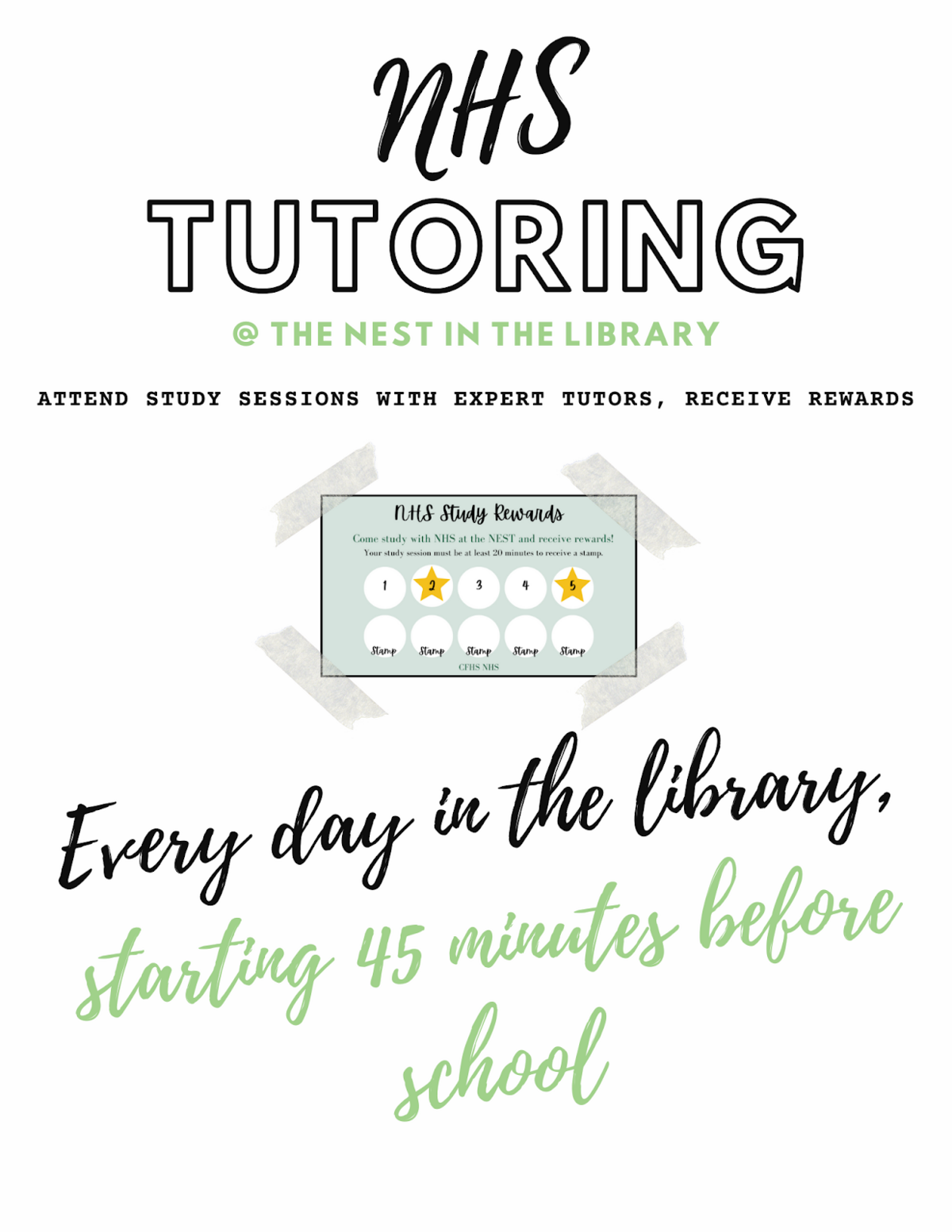 If any student is interested in tutoring or extra help in any subject area, we offer FREE, walk-in peer tutoring from National Honor Society students. This is available every morning in the CFHS Library starting 45 minutes before school begins. Please consider taking advantage of this wonderful opportunity. No appointments or advance notice required - just walk in. For any questions, please ask your school counselor.