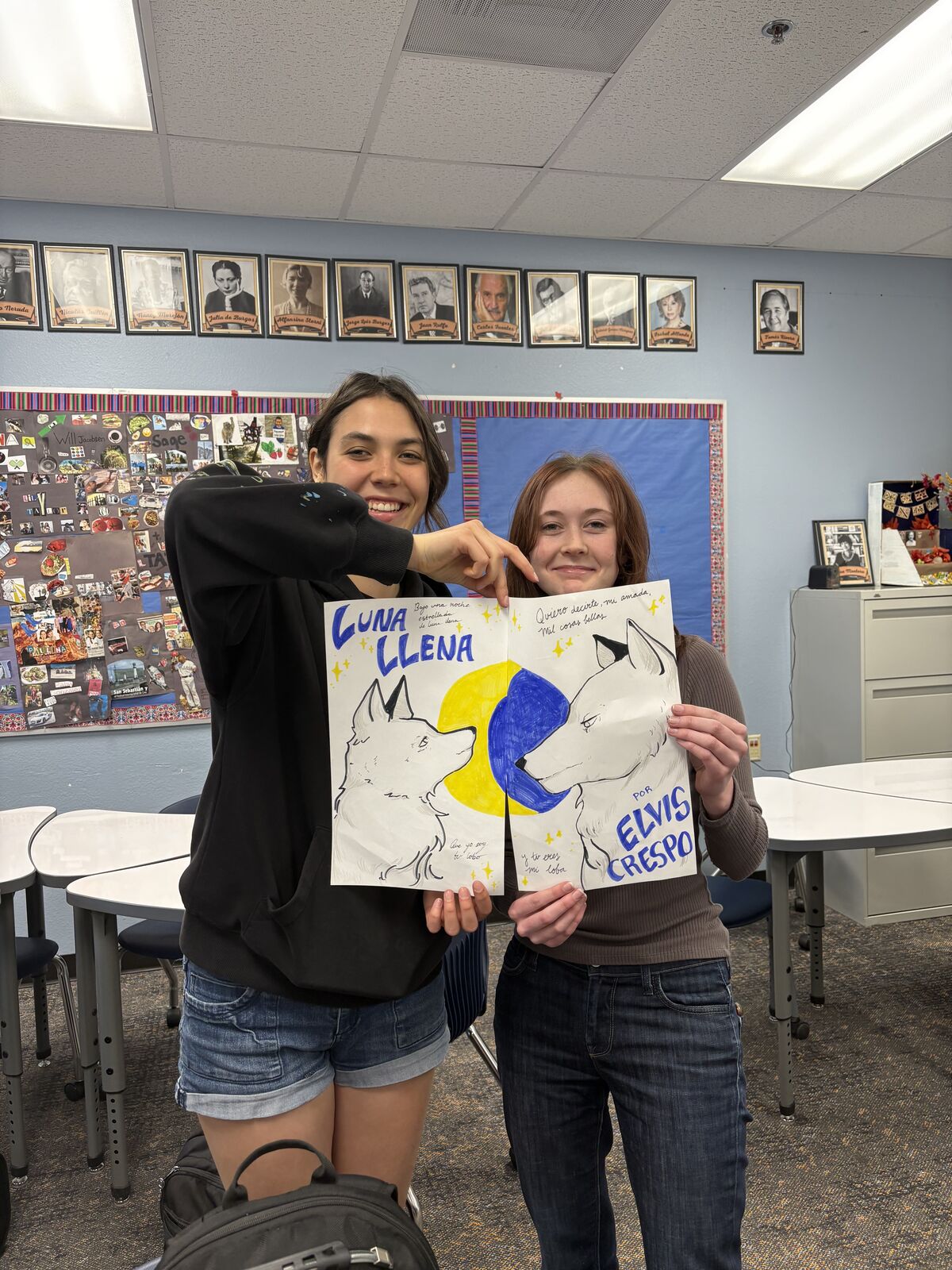 Two CFHS students show off their two interlocking lyric posters for “Luna Llena” by Elvis Crespo.